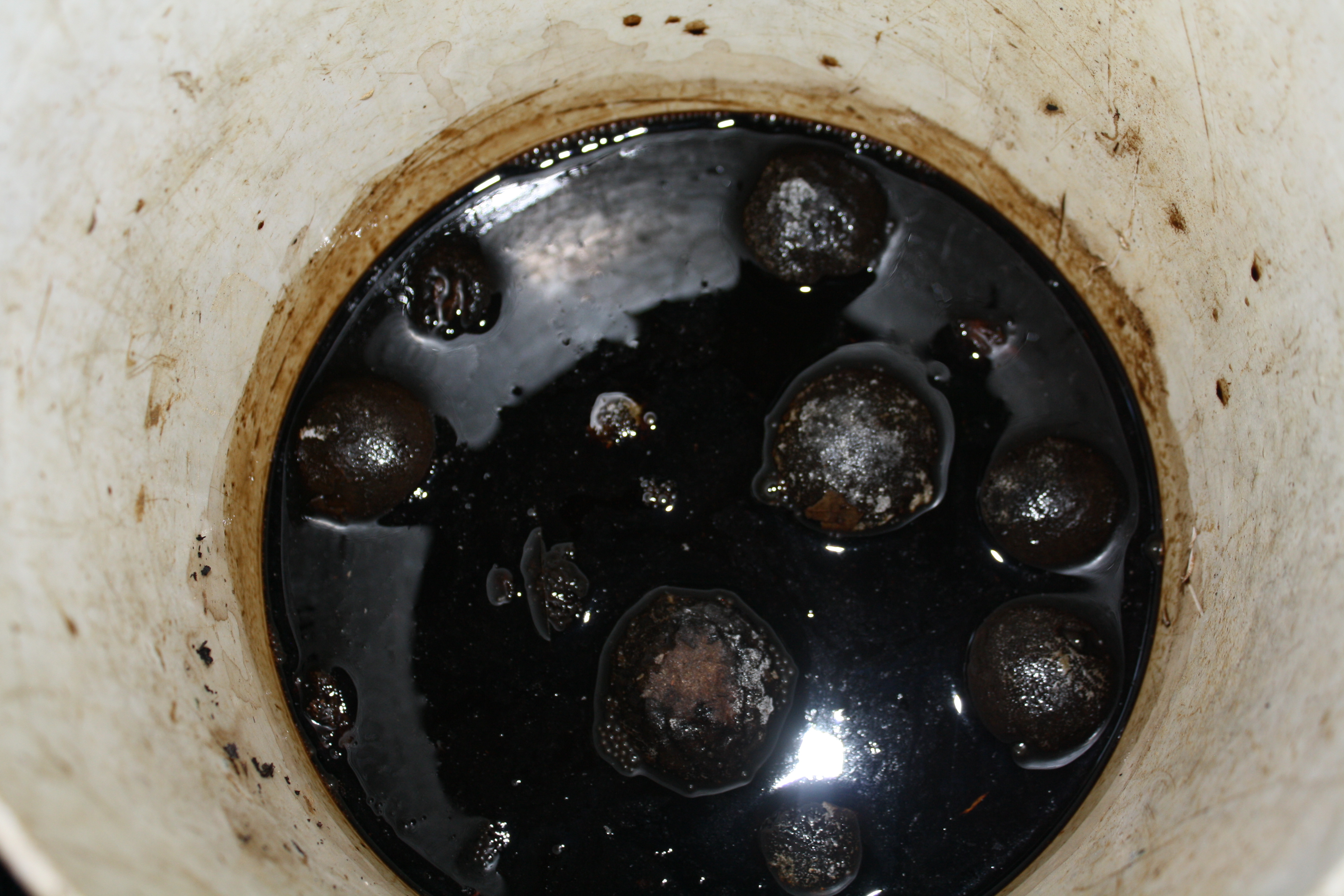 We got the black nuts that were heavy and not dried out. When we got about ten to twenty nuts, we took them to the house, and put enough water in with them to cover them by a couple inches. Then came the hard part. We left them to sit for a few days.